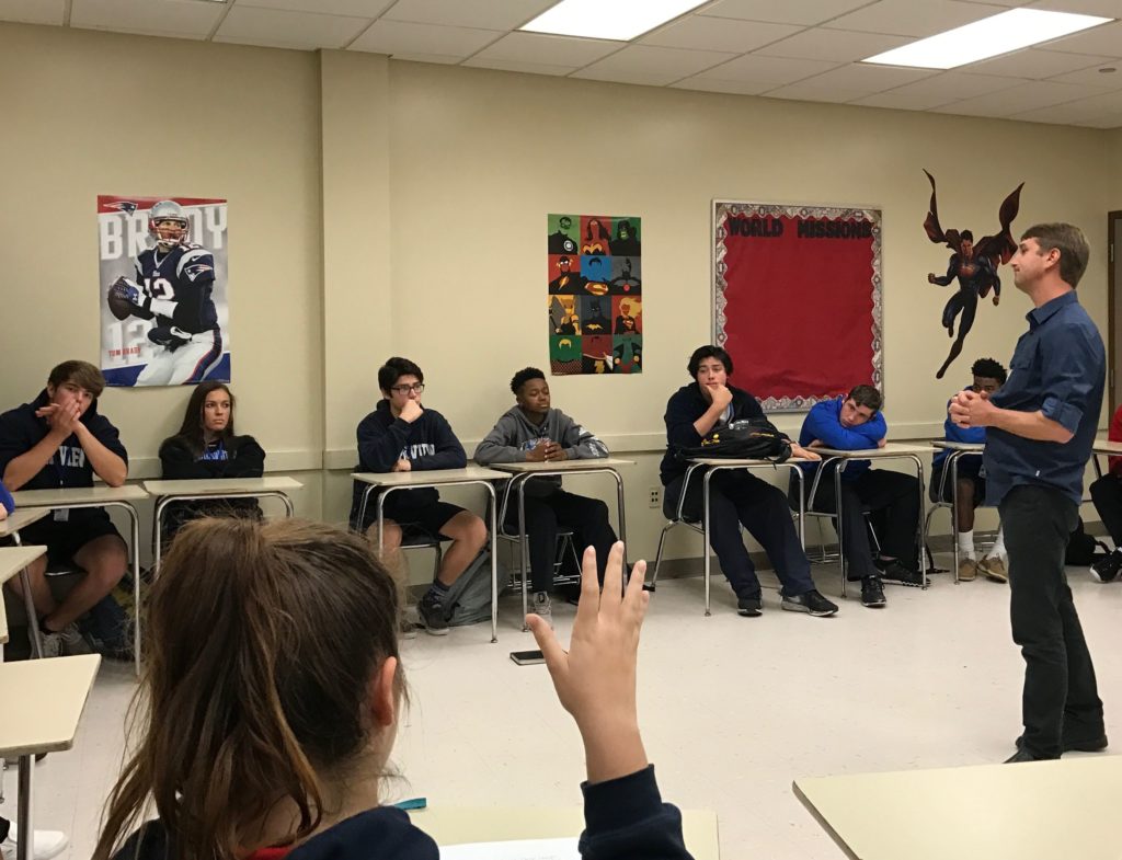 Pastor Preston Thompson of Redeemer Baptist Church visited with Mr. Kinchen’s Sophomore Bible classes in disguise as Dr. Broquet, a professor of ancient literature at Southwestern, to challenge our students to share their faith and defend what they believe. This was an exercise for the sophomore students to attempt to share the gospel with him as part of a unit on evangelism. Mr. Kinchen kept the identity of the speaker a mystery until they had an opportunity to share their faith.