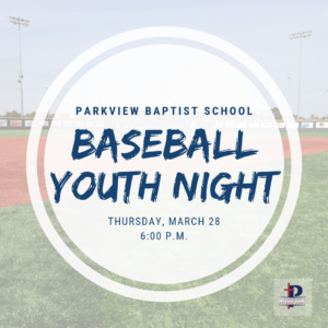 Join the Parkview Baptist Eagles for Baseball Youth Night as they play Plaquemine on Thursday, March 28 at 6:00 p.m. All PreK-8th grade students are welcome to attend this memorable night of fun!