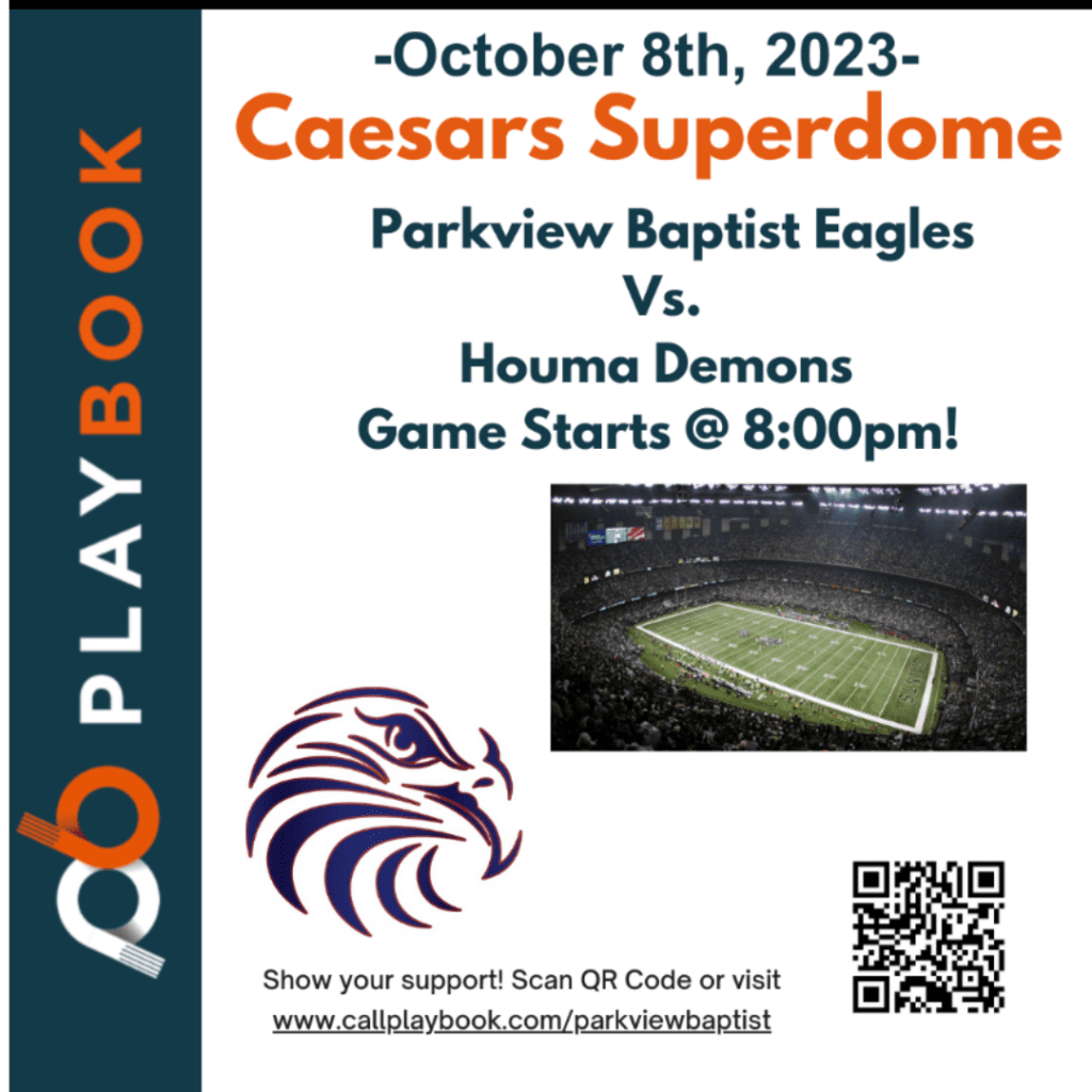 Tickets: Tickets can be purchased at this link: Parkview Baptist at Caesars Superdome (callplaybook.com) Please do not wait to purchase your tickets. A portion of all proceeds will be going back to each team, so there will be NO CASH PURCHASES AT THE GATE. Players and coachers are free as well as any child under 3 years old. Only those who buy field passes will receive access to the field, these are limited so get yours today.